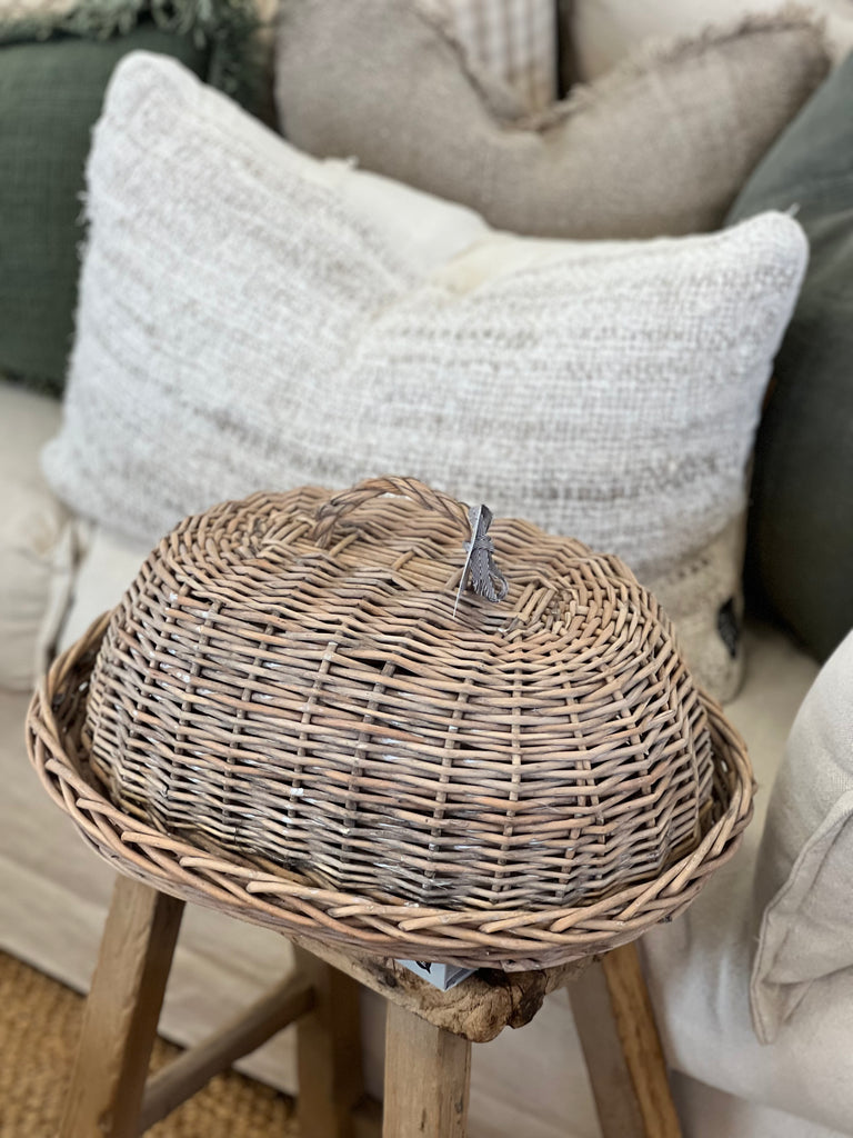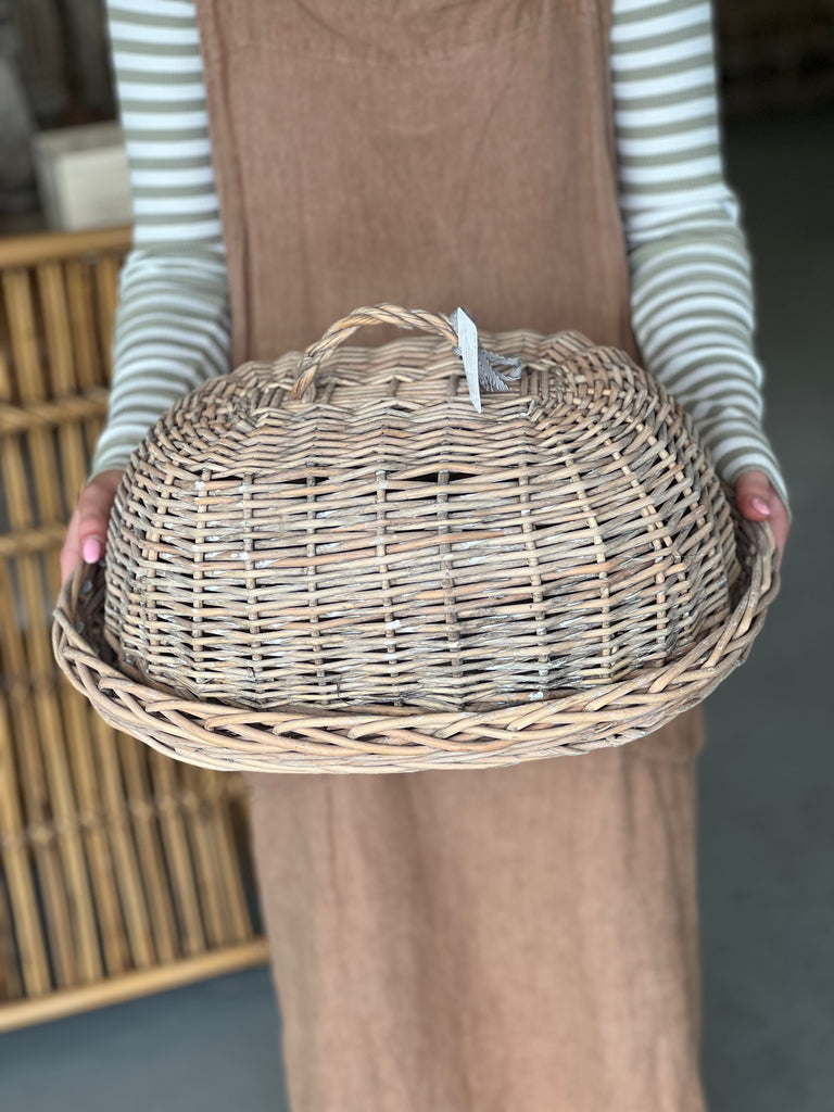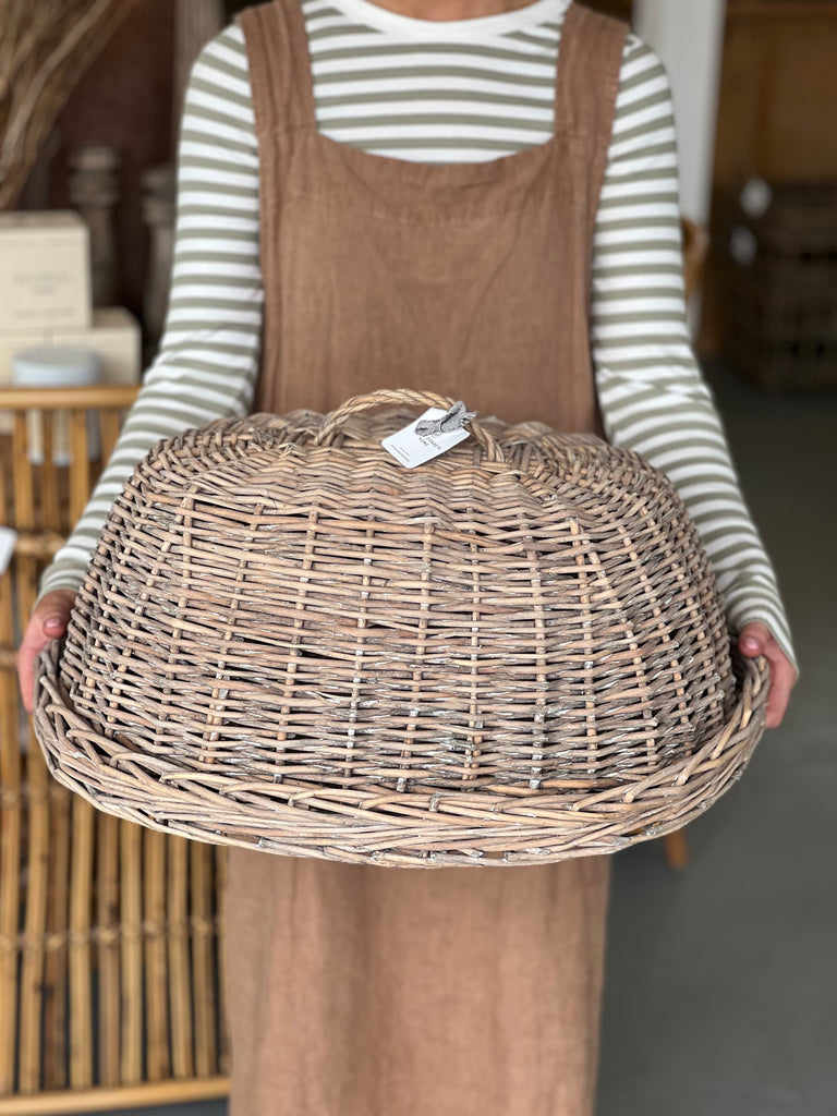 Oval wicker cloche with handle with matching tray. Perfect for displaying food. You can use the cloche and tray separately. Available in two sizes.