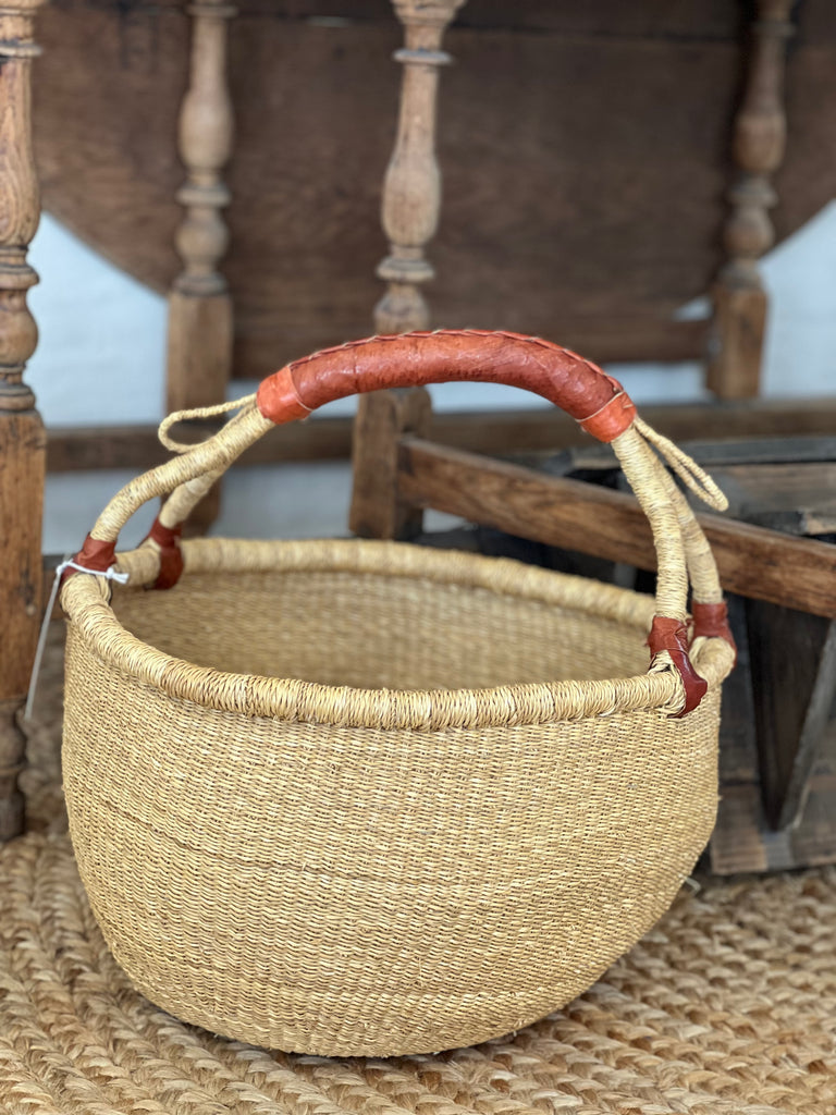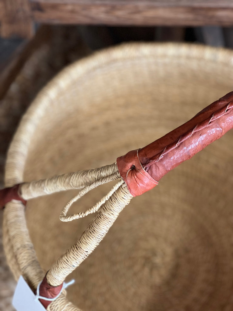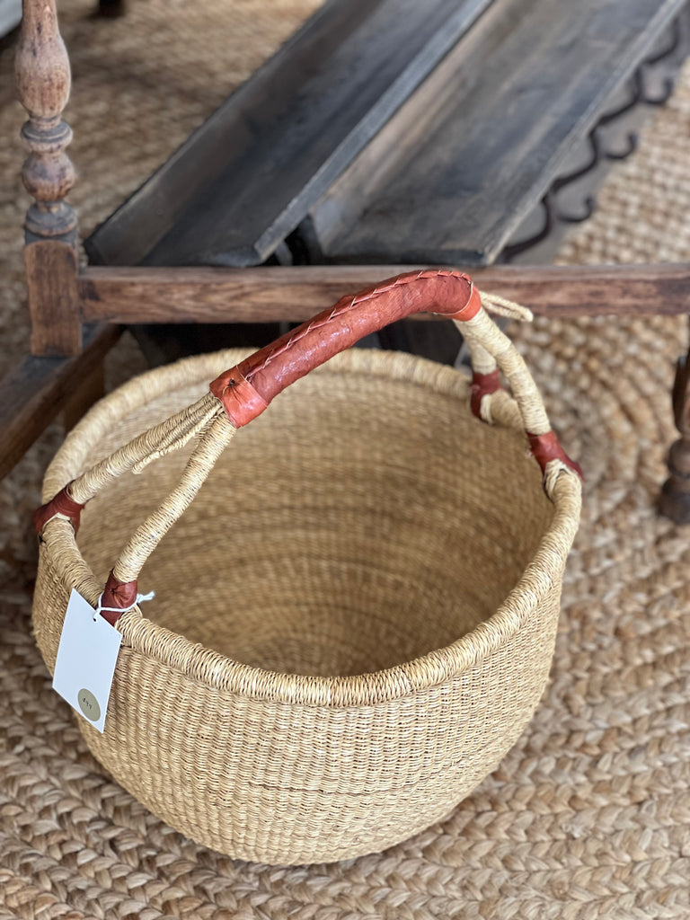 Handmade round market basket made of elephant grass by the Fra Fra people of Northern Ghana. Sustainable and biodegradable. Each one is unique and handmade, measuring approximately 42-45cm round. Note: If baskets ever get mishapen, they can be reshaped by submerging them in water for 30 seconds and reshape them by hand.